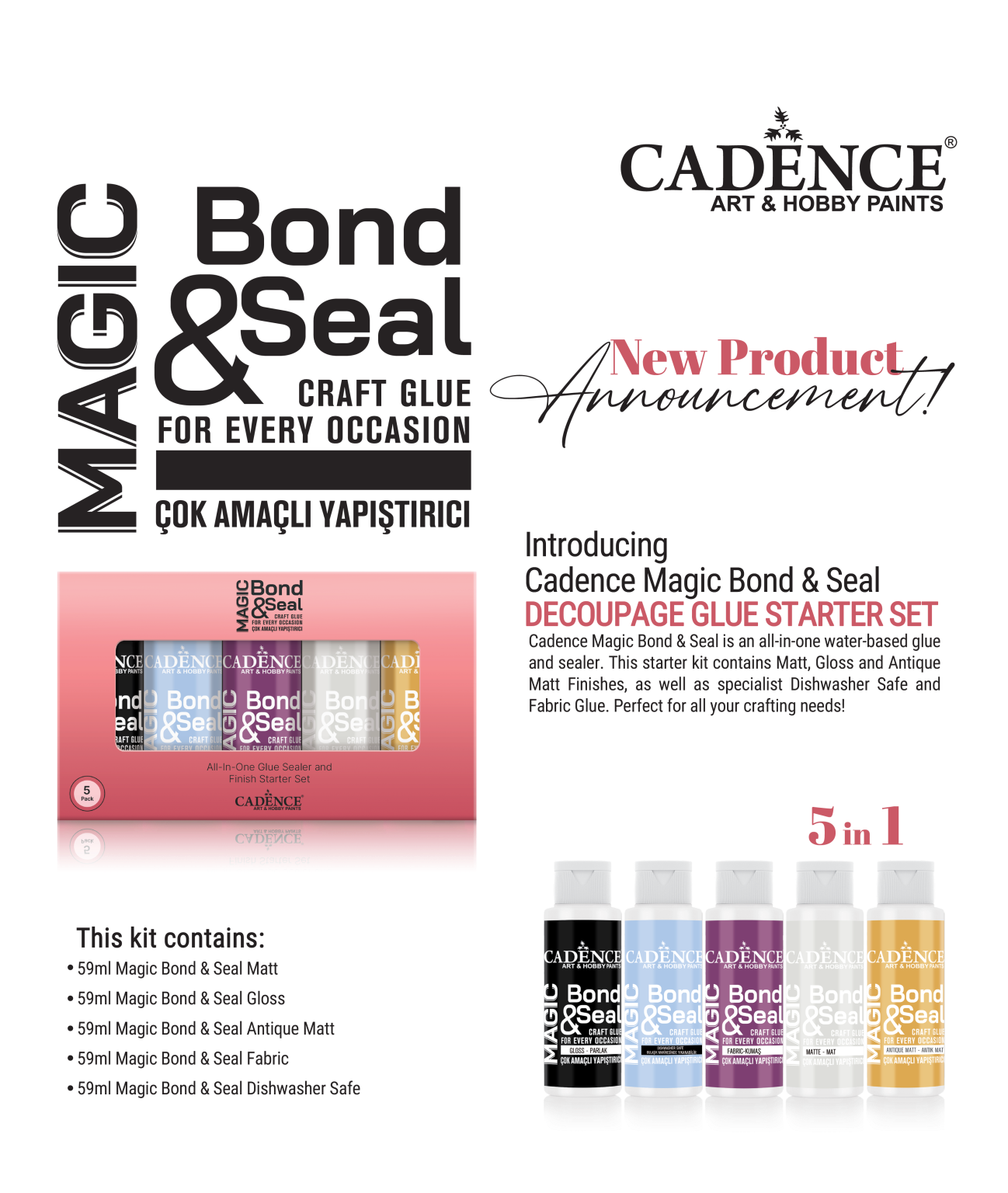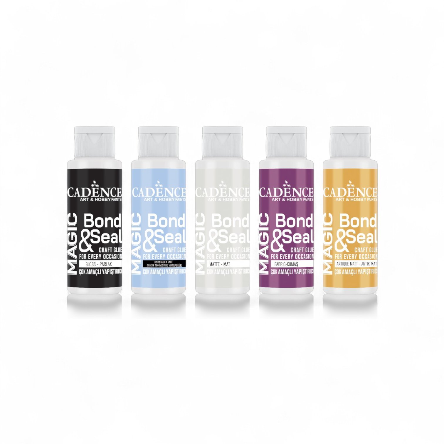 Cadence Magic Bond & Seal is an all-in-one water-based glue and sealer. This starter kit contains Matt, Gloss and Antique Matt Finishes, as well as specialist Dishwasher Safe Gloss Glue and Fabric Glue. Perfect for all your crafting needs!