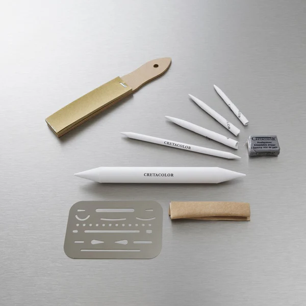 - Cretacolor Artist’s Drawing Accessories Set contains: blending paper; stumps and tortillas; eraser; eraser stencil; sharpening block.