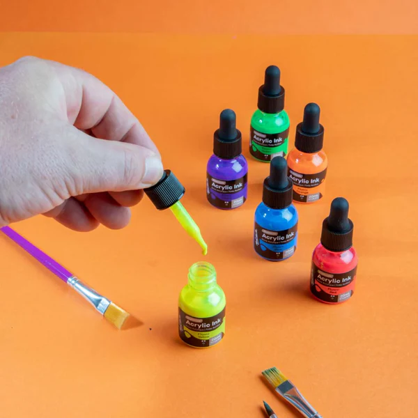 Create fine detail, washes of colour and so much more with our Fluoro Acrylic Ink 6pc. Inside the set are six acrylic-based inks in fluorescent colours that blend easily and mix cleanly. Thanks to their ultra fluid consistency, these versatile art inks can also be used in an airbrush, pouring art and pen and ink drawing. Plus, they’re water-resistant once dry, so you can layer other painting and drawing mediums on top. Each bottle comes with a pipette so you can precisely drop in colour, mess free! Best used on porous surfaces including, paper, card and canvas. Pick up an acrylic ink set and enjoy creating!