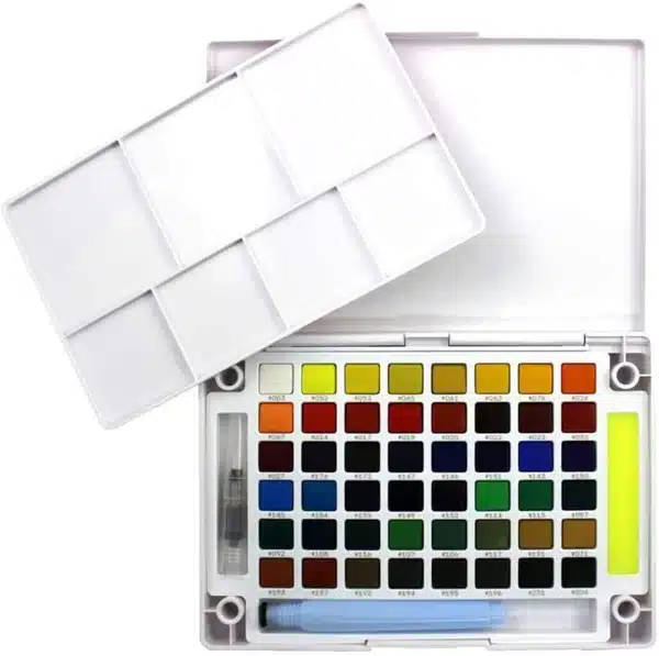 - Contains 48 shades in cake form, includes a portable water brush size#6(round medium) refillable 9 ml, dabbing sponge, removable palette, finger ring holder