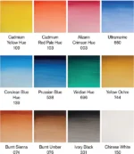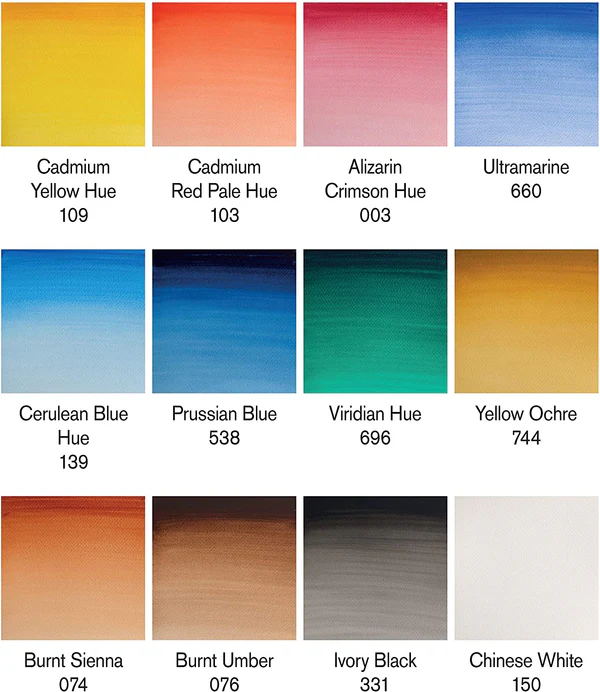 - This watercolour set contains twelve Cotman Water Colour 8ml tubes: Cadmium Yellow Hue, Cadmium Red Pale Hue, Alizarin Crimson Hue, Ultramarine, Cerulean Blue Hue, Prussian Blue, Viridian Hue, Yellow Ochre, Burnt Sienna, Burnt Umber, Ivory Black, Chinese White.